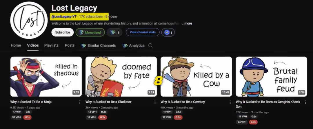 Lost Legacy is another channel in this field, with only 8 videos and 17,000 subscribers. The videos are very similar to those of the channel I showed you earlier.