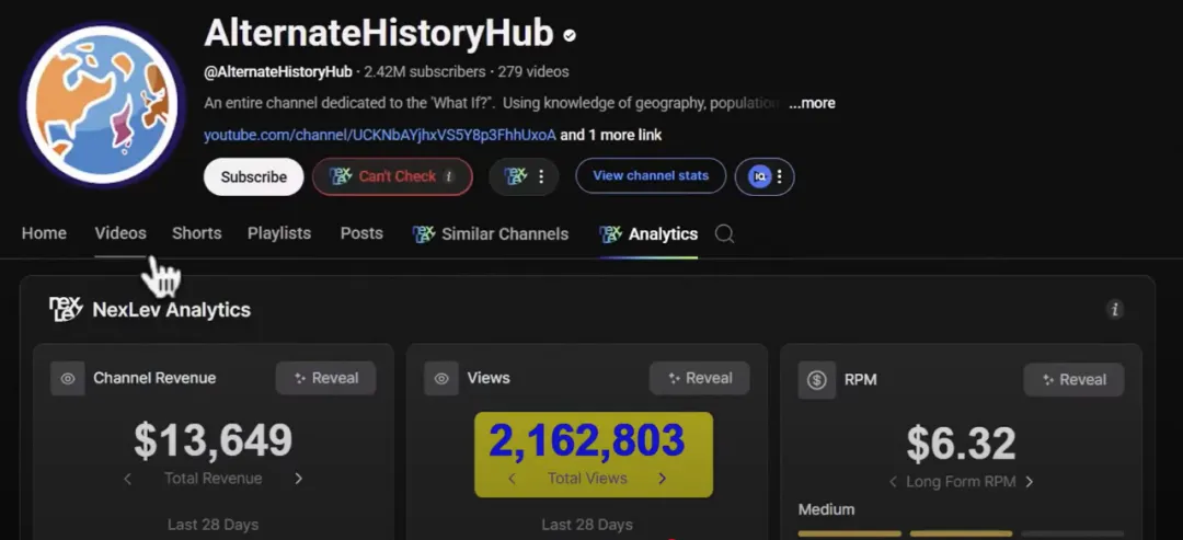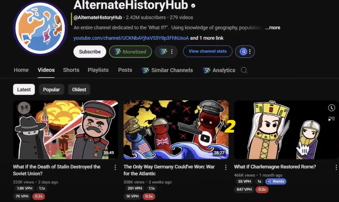 Alternate HistoryHub is a very popular channel in this field, with over 2 million subscribers. They use these unique animated characters to create historical videos, which receive over 2 million views each month.