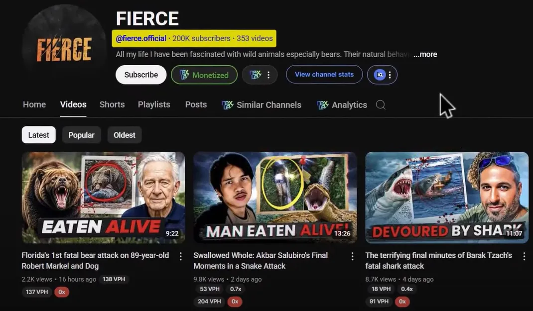 Fierce is another one, with better thumbnails and over 200,000 subscribers. Final Affliction is the largest channel in this field, with over 2 million views per month and earning over $7,000 per month.