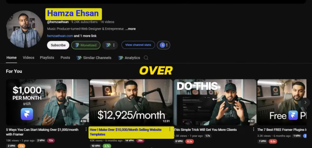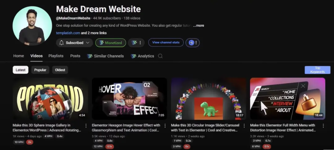 There are many monetization methods in this niche. For example, the Make Dream Website channel shares tutorials on building websites with WordPress, and there are many links to products and services in the videos. He has earned a lot by building websites for clients and running a template store (selling Elementor and website templates) – just one template has sold over 4,200 copies, at $4.99 per copy, earning over $21,000 from this single product alone. Moreover, the RPM in this field is very high, with $22 in revenue per thousand views, and he can earn an additional $1,900 per month from advertising on top of the above income.