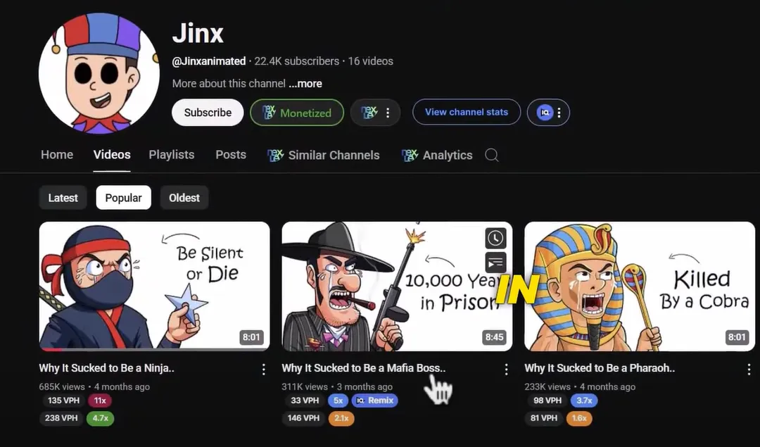 This is another new niche area that is currently very popular and has low competition. You need to think of a strange job or position that a man might encounter in life, and then add ” Why doing something is bad ” in front. Jinx is a very popular channel in this area, producing videos such as “Why being a ninja is bad” and “Why being a killer is bad” and so on. Their thumbnails are simple and consistent. If you watch their videos, you will see them using animated characters, text, and icons to tell stories. They have 500,000 views per month and earn over $2,000 per month.