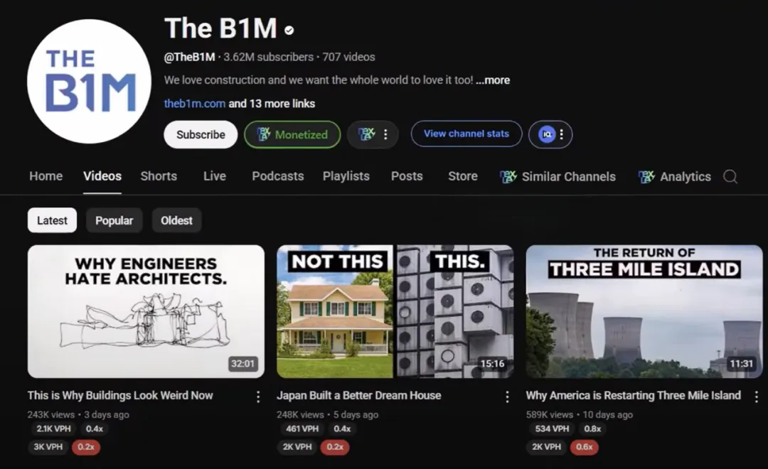 The B1M is a larger channel that produces similar videos and already has over 3 million subscribers. They break down the engineering aspects of projects and receive over 9 million views per month.