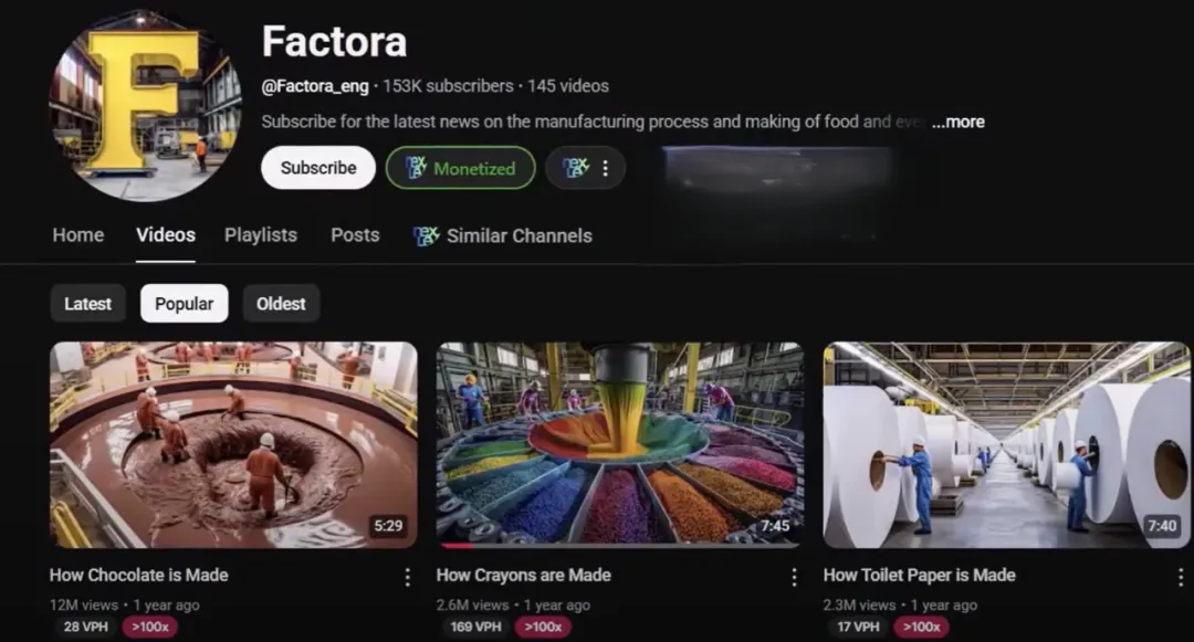 Channels in this field use factory videos to showcase the production process of daily products. Factori, a very popular channel, creates videos on the manufacturing processes of various products, such as chocolate, toilet paper, and cement, and earns over $3,000 per month.