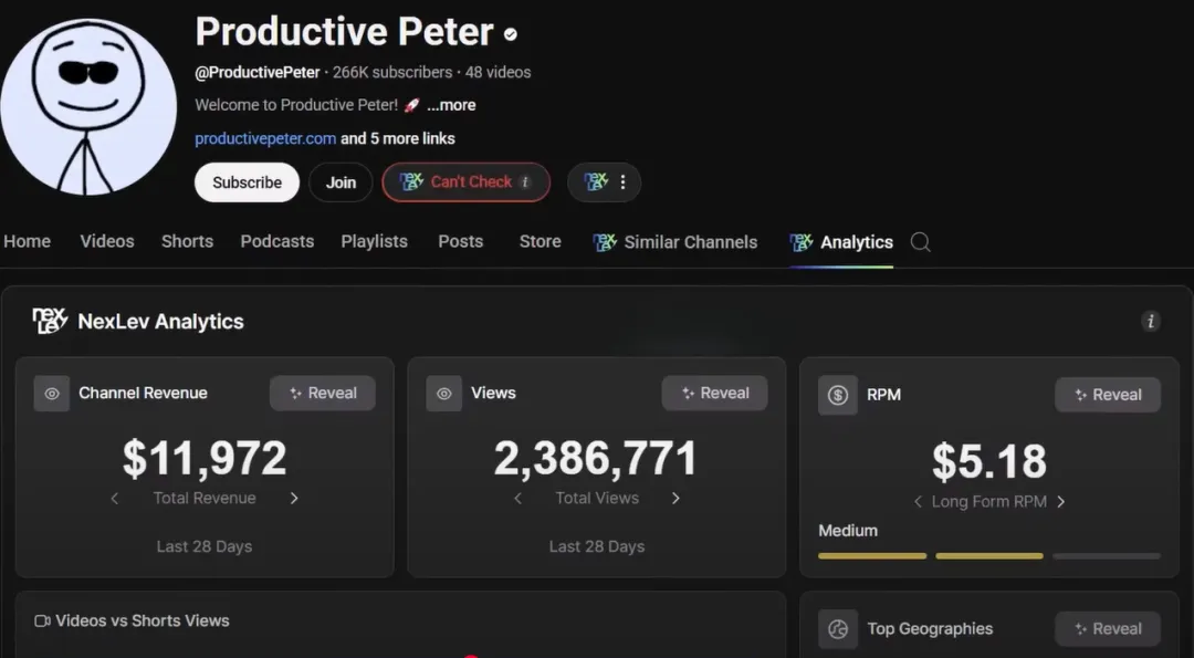 This is another area with a new style that can be applied to many other fields. This type of video usually features simple line animated characters, along with a bunch of other graphics, explaining the topic very clearly. We’ve seen some channels in the productivity field use this style, such as Productive Peter , who has over 260,000 subscribers with just 48 videos. These videos and thumbnails can be easily created using tools like Canva. With over 2 million views per month, they can earn $11,000 per month.