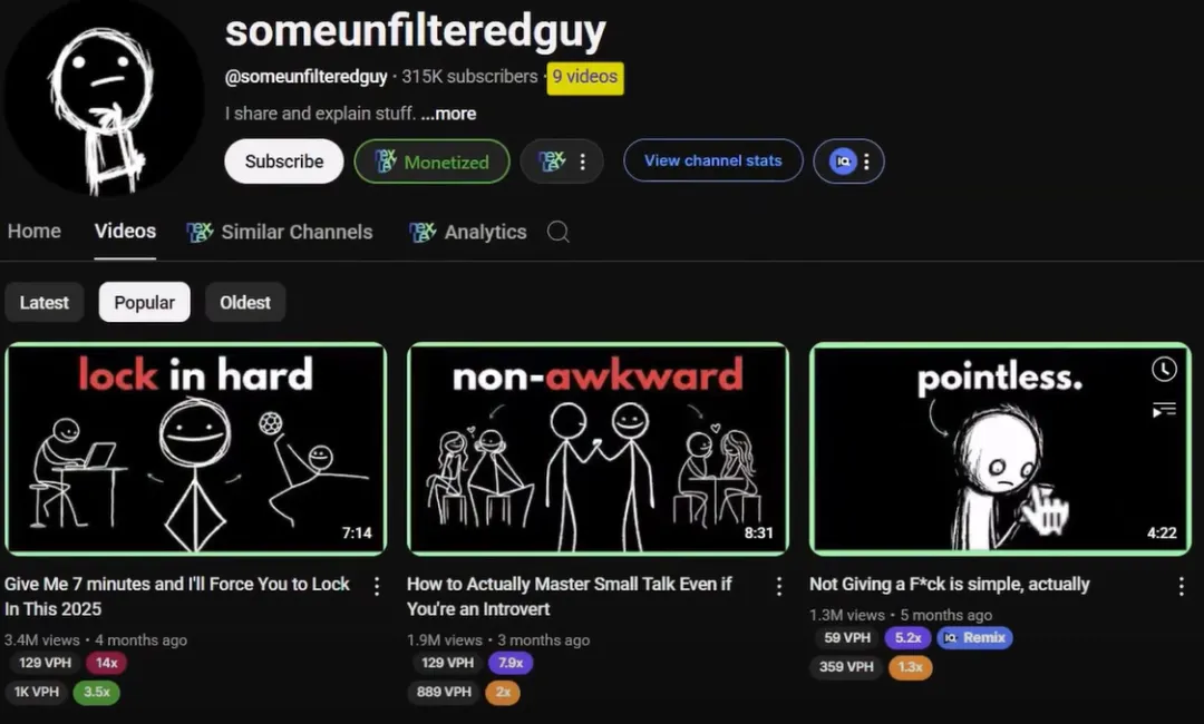 This style is also suitable for self-development videos . Some Unfiltered Guy is a channel in this field, with only 9 videos but already having over 300,000 subscribers. He uses white animated characters on a black background, the opposite of the previous channel, but the effect seems better.