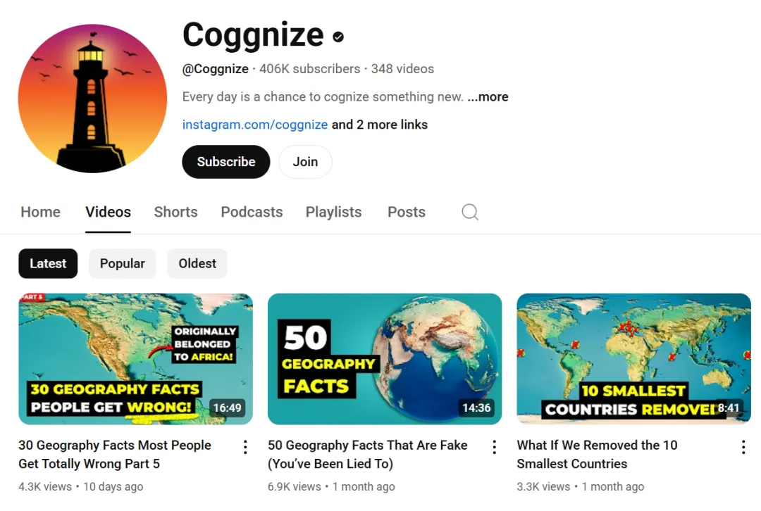 This is also a new field. You may have seen videos that use world maps to explain scripts. They add some lines, text, zoom effects, and clear narration. Cognize is a major channel in this field, with over 400,000 subscribers. It creates videos about countries and geography, as well as videos for YouTube Shorts. The fact that its Shorts can get 17 million views indicates that this field is more popular on Shorts than on long-form videos.