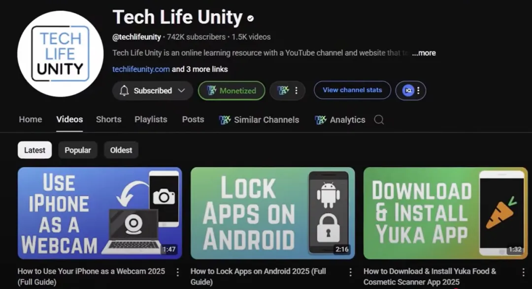 This is a search-based field, and it’s also the only field in this video that can be fully done on a mobile phone. You only need to create a one- to two-minute mobile app tutorial, like Tech life Unity , and you can have a lot of stable income. Think about popular apps like TikTok, Facebook, and Instagram, and create some tutorials that solve people’s problems.
