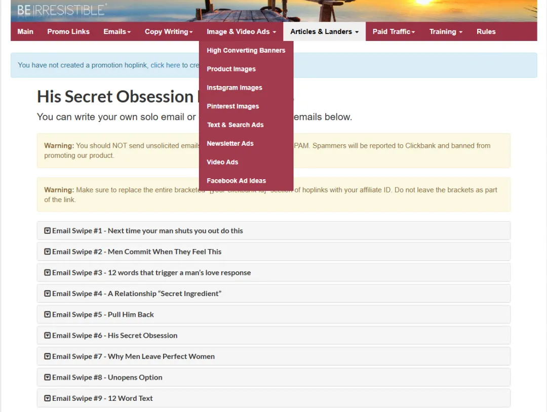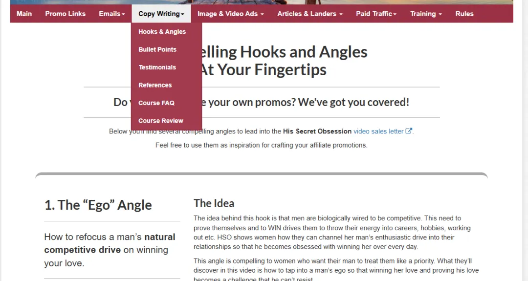 Additionally, we can also utilize the affiliate resource pages of merchants. For example, the resource page of this relationship-based product on CB features highly detailed copy, email templates, as well as ready-made articles and videos. These creatives have been carefully crafted by the merchants and are already capable of appealing to consumers. We can simply use AI to process or edit them to create attractive videos.