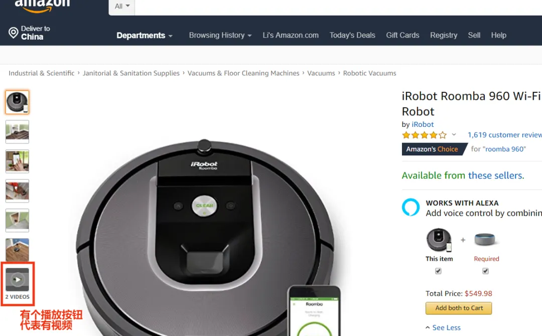 Nowadays, many products come with introduction videos. For example, this floor cleaning robot, the one with a play button has a video, and we can download it. The method is very simple: right-click to open the page source code, search for “mp4”, find the full link of the video – there may be dozens of URLs containing “mp4” in the source code, copy the corresponding address, open it in the browser, right-click on the video and select “Save as” to save it to your computer.