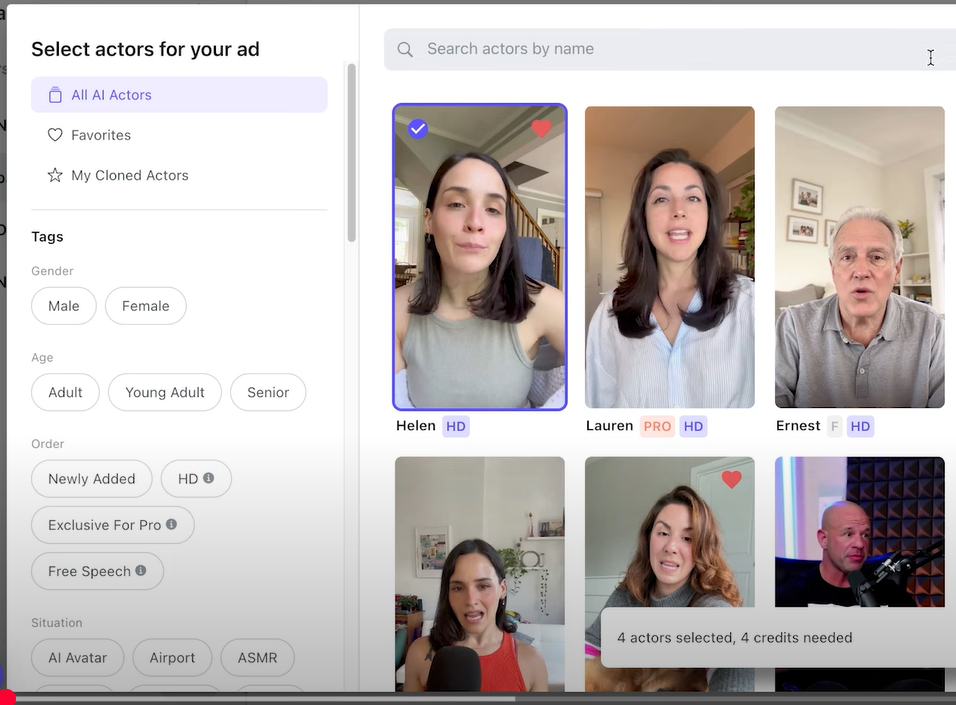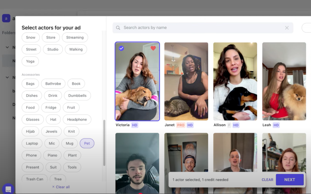 On the left, you can filter actors by gender, age, scene, and even the accessories they’re holding. Since we’re promoting dog toys, I thought it would be interesting to find someone with a dog, so I chose Victoria. I also selected Vincent, who looks very impactful. I picked Lily from the collection, but wanted to change the scene, so I used the current one.