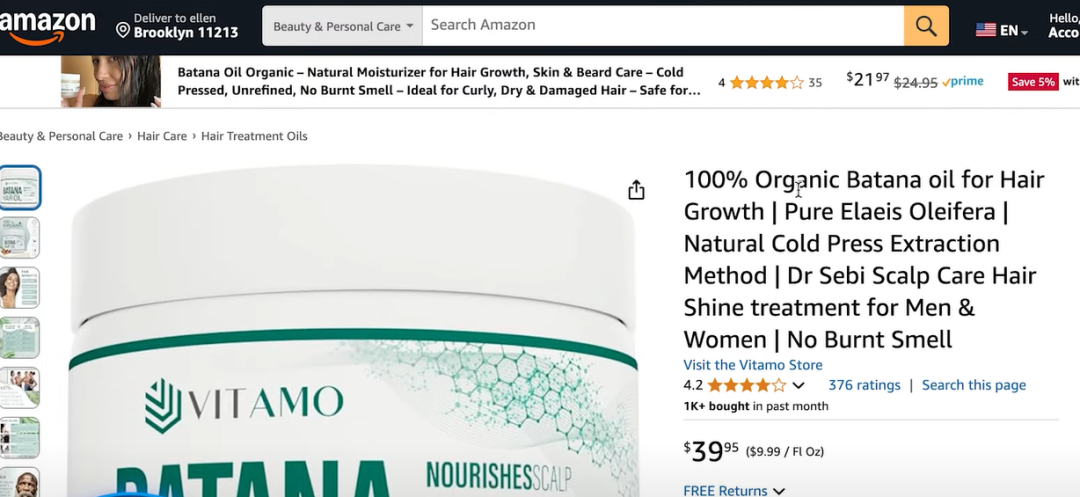 The second method might be a bit easier, but it depends on what product is being promoted. This page is full of UGC content, and you can see an Amazon link, which is an affiliate link. They’re selling $40 organic batana oil that promotes hair growth. I checked, and this luxury beauty product offers a 10% commission, earning $4 per sale, which is quite high.