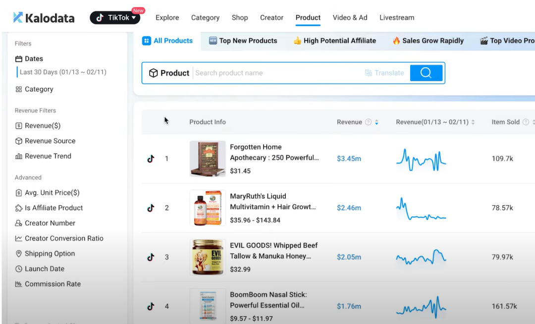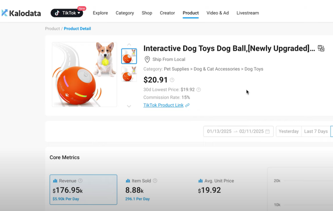 To find good products, you need to use a tool called “Kalodata.com ” (with a 7-day free trial). You can find best-selling products on it. For example, on the settings page, you can browse products without setting any filters, see which ones are suitable for making videos, and also filter and screen. I tried some filters and found this interactive dog toy ball, which is quite good.