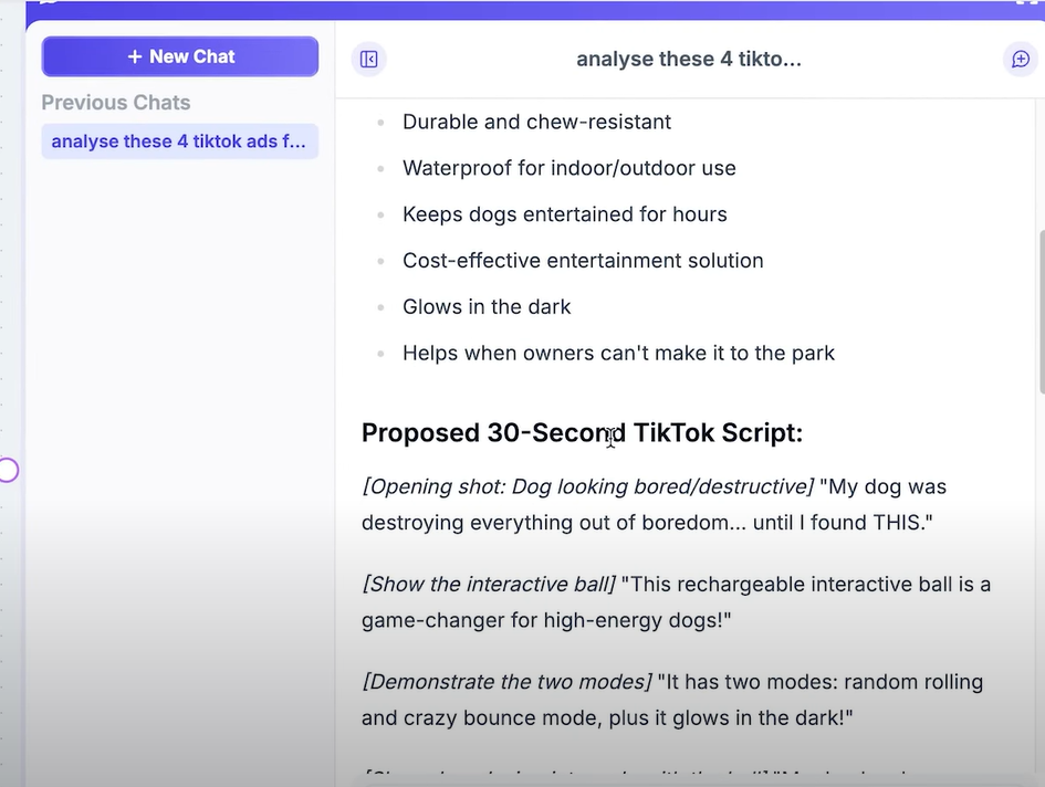 Once we have the product, it’s time for the next step: making videos. We can see the already popular relevant content on TikTok Shop. Analyze these ads using AI, and then put them all into a tool called getpoppy.ai . I imported all the videos, had it analyze these four TikTok ads, and write a script for UGC creators. It did a great job, even telling me what shots to use in the video.