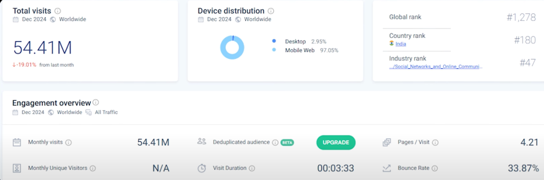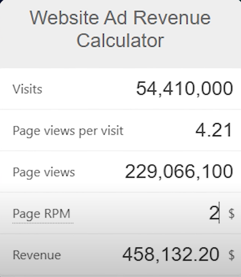 If it’s completely free, how does it make money? Look, the website is full of ads everywhere. Every time someone visits the website, it can make money. How much can it make each month? We can make an estimate. Similar websites show that it has 54 million visitors per month, with each visitor browsing an average of 4.21 pages. A lot of this website’s traffic comes from India and Pakistan, and I estimate that the revenue per thousand page views (RPM) is very low, only $2. Even with such a low estimate, this website can still make $458,000 per month. If the RPM can reach $4, it could even make $1 million per month. This shows that being free doesn’t mean you can’t make big money.