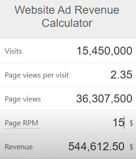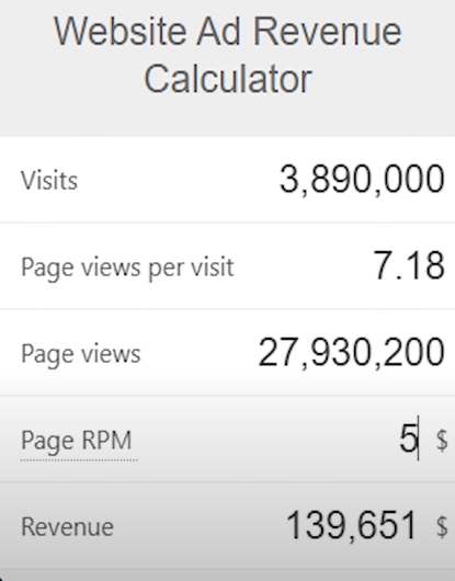 For such a simple blog, how much money can it make by adding a free coin value search function? You can see that there are display ads everywhere on the website. Let’s use a display ad calculator to figure it out. I estimate that the RPM is relatively high, around $10, with each visitor browsing an average of 2.41 pages. The coin value checker can earn over $21,000 per month just from display ads, and there are also affiliate links on the website, so it will surely earn even more.