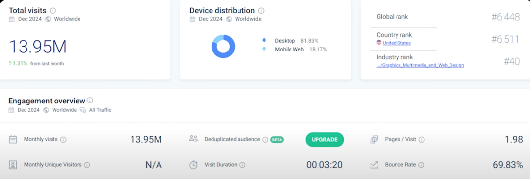The sixth website is photopea.com , a free alternative to Photoshop. It’s not a simple tool; building it is a bit complex, but it was indeed built by a programmer, at least initially. People use this free tool, and the website makes money through advertising. With nearly 14 million visitors per month, each visitor browsing an average of 1.98 pages, it’s a veritable cash cow. Do you want to earn $200,000 per month from a free tool you built? This idea really blows my mind.