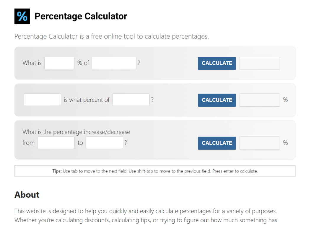 The fifth website is percentagecalculator.net , a simple calculator website that is completely free but makes money by displaying ads. This website has 2.78 million visitors per month, with each visitor browsing an average of 1.36 pages, and a lot of traffic comes from Google organic search. If RPM is calculated at $5, this website can earn $18,900 per month.