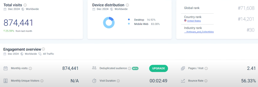 How’s the traffic on this website? It’s not as much as the previous ones, but it still has 874,000 visitors per month, and many come from search. This website seems to have been penalized by the algorithm and then recovered, and it’s still growing. Could adding a free tool feature to the website be the reason for its recovery? Search traffic comes from terms like “Value of 1944 Wheat Penny” and “Value of Rare Quarters and Nickels”.